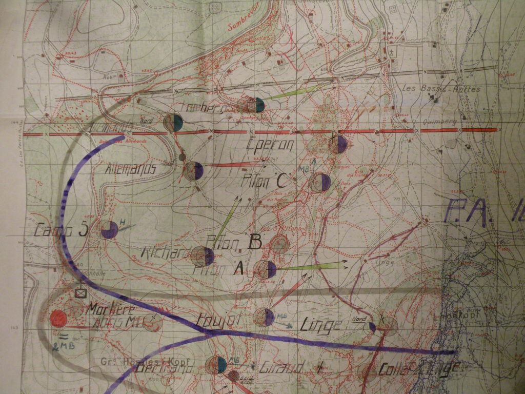 On doit améliorer ce que nous avons. D’abord ne pas consentir au recul progressif de nos G.C. puis refaire des abris et les boyaux. Enfin avoir un barrage d’artillerie et de mitrailleuses sur les pentes Ouest du Linge analogue à celui qui a été présent et existe sur les pentes Ouest de l’HWK [Hartmannswillerkopf], entre le sommet et le Silberloch.