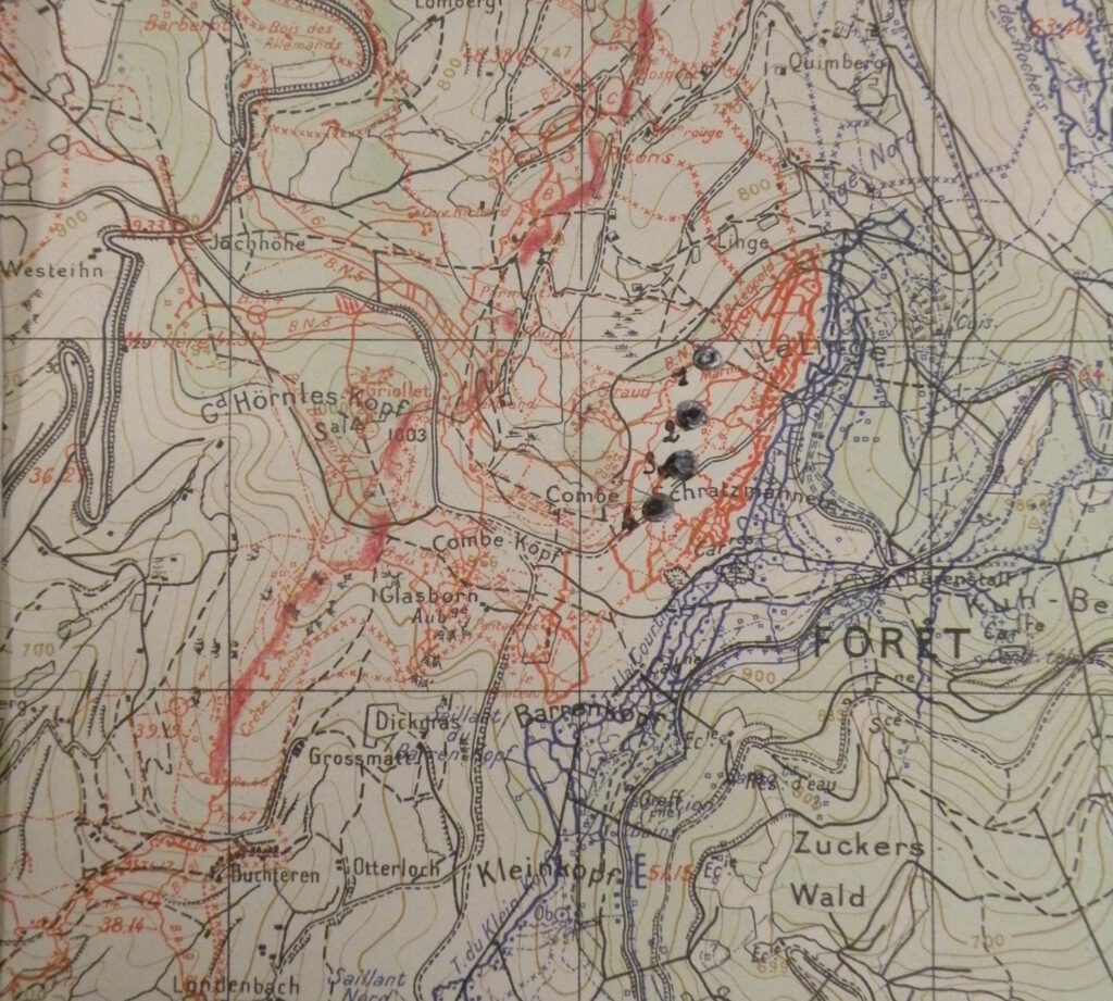 Les G.C. qui se trouvaient primitivement accrochés sur les pentes bouleversées du Linge, complètement en l’air, et dominés entièrement par les boches ne sont pas maintenus comme G.C. fixes et viennent contribuer à augmenter la défense de la crête ci-dessus, particulièrement en créant un nouveau G.C. entre Poujol et Combekopf à la tête du col.
