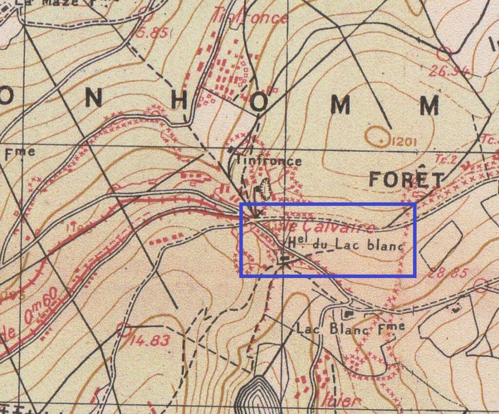 il n’a pas encore été possible de réparer suffisamment la route de la Schlucht pour le transbordement des blessés, qui est effectué à bras provisoirement sur le chemin allant du Col de la Schlucht à la Cote 1028, à 200 mètres environ au Nord de l’Hôtel de l’Altenberg (carte allemande au 1/20.000e).