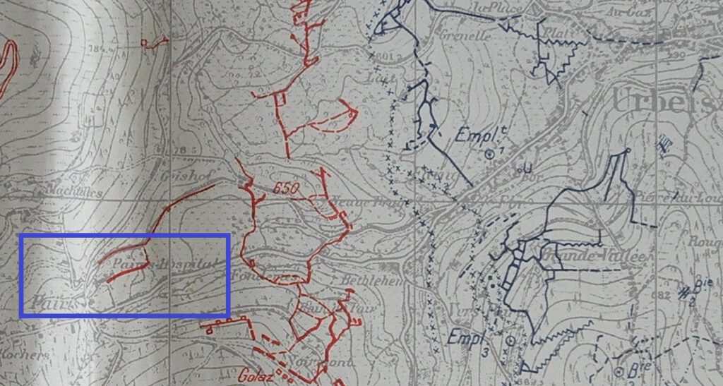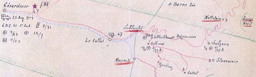 Dès le 23 mai, le médecin divisionnaire de la 47e DI effectue une tournée et reconnaît la route de Wettstein au Col de la Schlucht via Soultzeren, route qualifiée de « grande voie naturelle d’évacuation ».